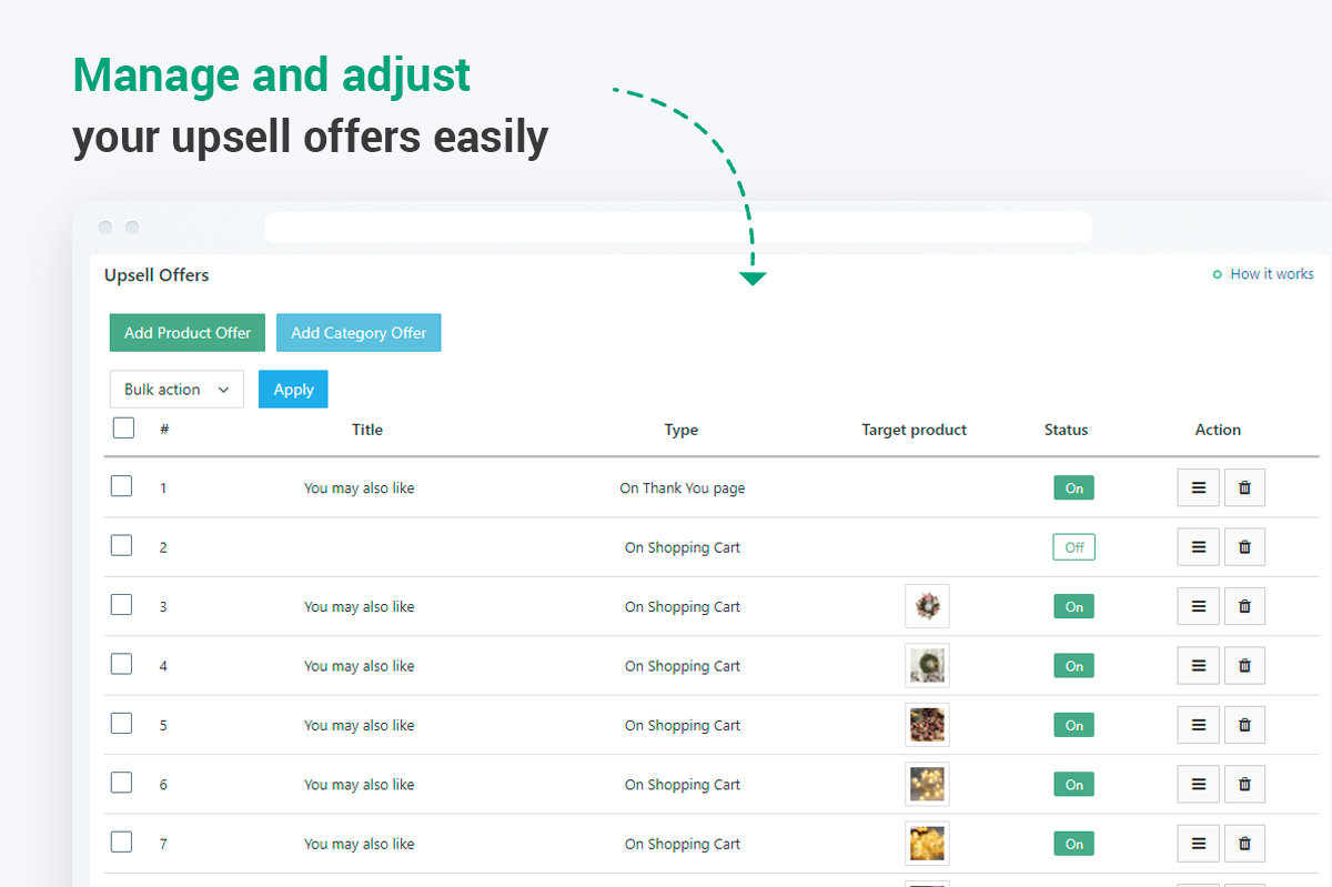 More specifically, you can easily select the main and upsold products, write a snazzy text to attract even more buyers, and choose the placement of the offer.